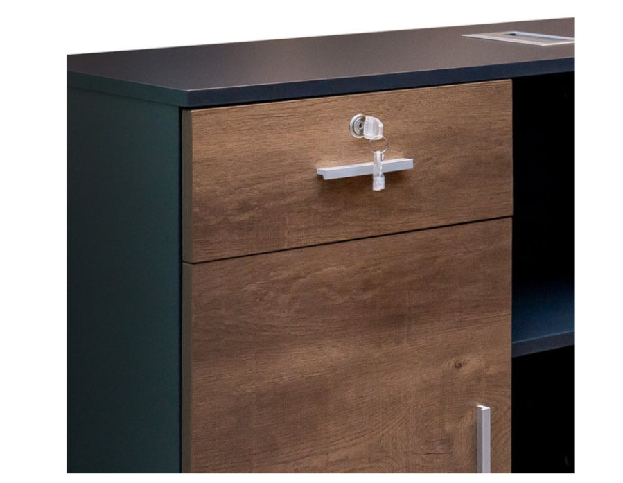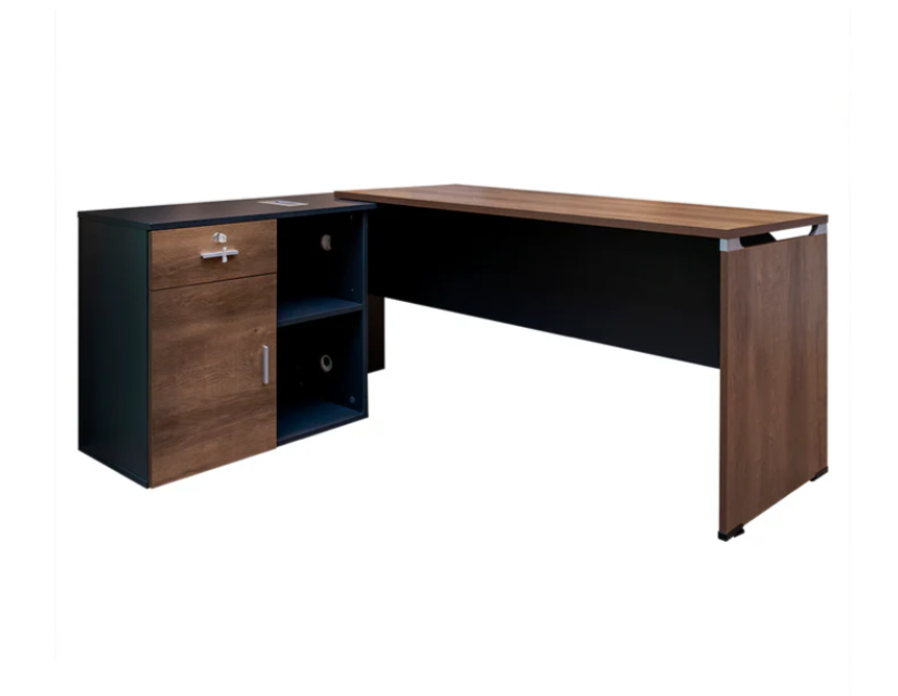 Las oficinas con un carácter mas gerencial precisan de escritorios que aporten estilo, personalidad, pero también precisan que sea funcional. Este escritorio cumple con creces con estos requerimientos. La parte de trabajo tiene unas dimensiones generosas y el retorno cuenta con los espacios necesarios para tener un espacio de trabajo organizado de manera adecuada.